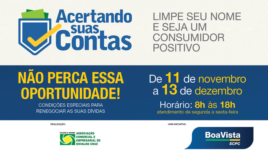 A ACEOC - Associação Comercial e Empresarial de Osvaldo Cruz e a Boa Vista SCPC realizam até o dia 13 de dezembro a campanha "ACERTANDO SUAS CONTAS".