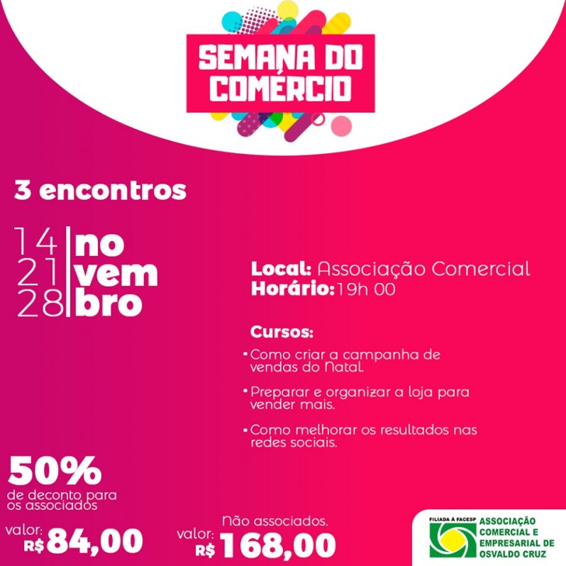 A ACEOC (Associação Comercial e Empresarial de Osvaldo Cruz) e o SEBRAE/SP - Presidente Prudente promovem no mês de novembro, a SEMANA DO COMÉRCIO.