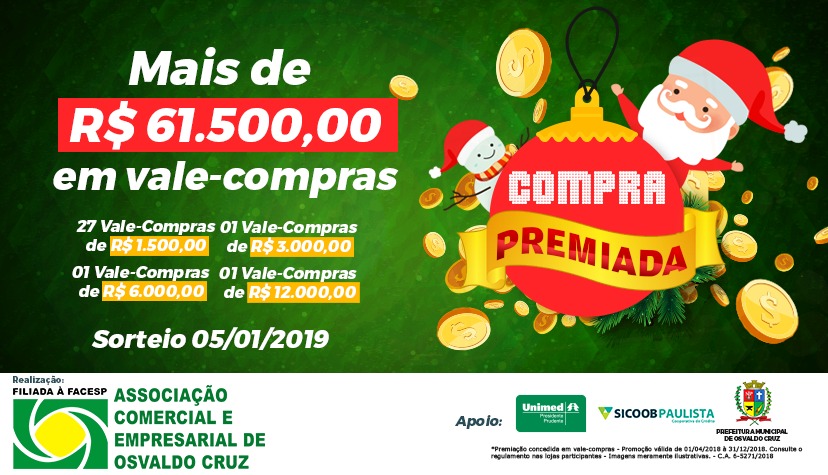 A ACEOC conta com o apoio da Prefeitura de Osvaldo Cruz, Siccob Paulista e Unimed para a realização da "Compra Premiada 2018".