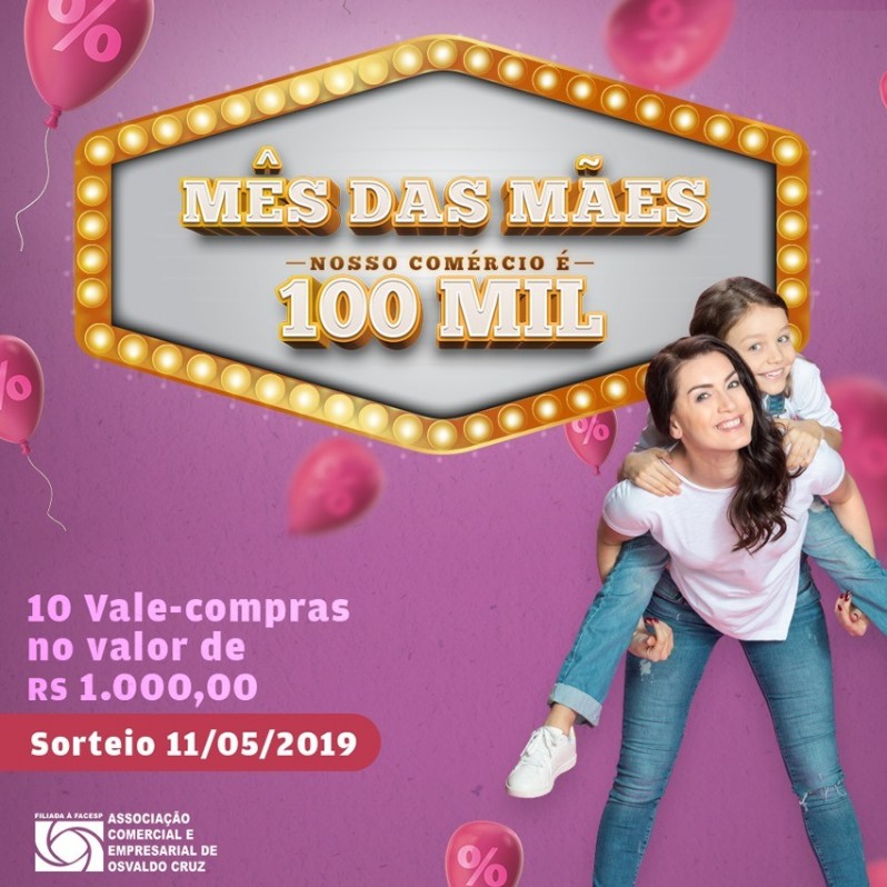 A Aceoc (Associação Comercial e Empresarial de Osvaldo Cruz) está em fase final de preparação para o primeiro sorteio da Campanha 'Nosso Comércio é 100 Mil'. Nesta primeira etapa, que acontece por conta do Dia das Mães, serão sorteados 10 vale-compras de R$1 mil cada.