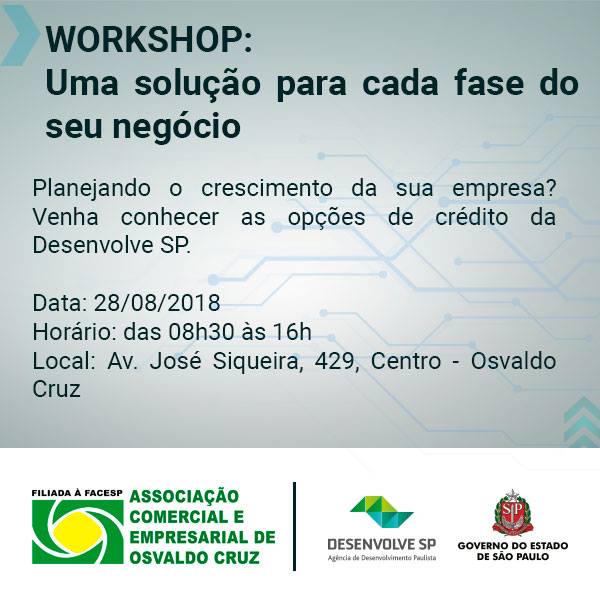 A ACEOC (Associação Comercial e Empresarial de Osvaldo Cruz) realiza no próximo dia 28 de agosto, das 8h30 às 16h, em parceria com a Desenvolve SP (Agência de Desenvolvimento Paulista), um workshop de negócios para empresários da cidade e da região.