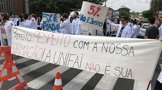 Os atos públicos dos estudantes de medicina, com pautas de reivindicação que repercutirão na qualidade e reputação do curso e da instituição, e nos serviços à comunidade, têm se tornado frequentes. Em fevereiro do ano passado protestaram contra nomeações feitas pela UniFAI, entre as quais da professora doutora Marisa Cardin para a coordenação do curso (reveja), que depois solicitou o cancelamento de sua nomeação (reveja). Já em novembro do ano passado eles foram às ruas cobrando definições sobre o internato, o que ainda era um panorama incerto (reveja). E mais recentemente, também se posicionaram contra uma portaria que designou Marisa Cardin como gestora do termo de colaboração firmado entre a UniFAI e a Santa Casa de Araçatuba, levando a UniFAI a fazer outra nomeação.