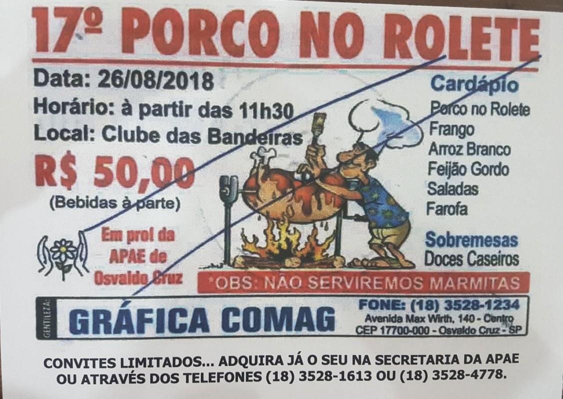 A APAE de Osvaldo Cruz promoverá no dia 26 de agosto, o seu 17º Porco no Rolete, à partir das 11h30, no Clube das Bandeiras. No cardápio ainda estão inclusos o arroz branco, feijão gordo, frango, saladas e farofa. Para a sobremesa, serão servidos deliciosos doces caseiros.