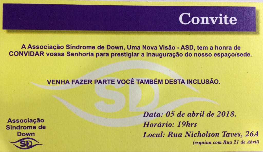 A Associação SÃndrome de Down, Uma Nova Visão - ASD, já está preparando um evento especial para a inauguração de sua nova sede, onde poderá continuar prestando importantes serviços relacionados ao atendimento à s pessoas especiais e suas famÃlias.