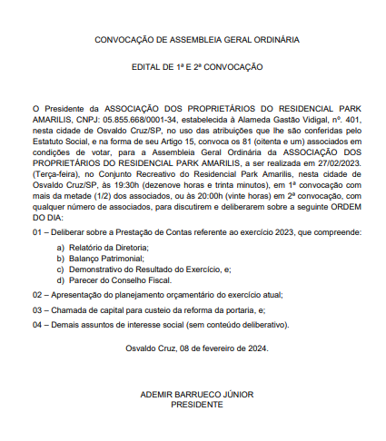 O Presidente da ASSOCIAÇÃO DOS PROPRIETÁRIOS DO RESIDENCIAL PARK AMARILIS, CNPJ: 05.855.668/0001-34, estabelecida à Alameda Gastão Vidigal, nº. 401, em Osvaldo Cruz/SP, no uso das atribuições que lhe são conferidas pelo Estatuto Social, e na forma de seu Artigo 15, convoca os 81 (oitenta e um) associados em condições de votar, para a Assembleia Geral Ordinária da ASSOCIAÇÃO DOS PROPRIETÁRIOS DO RESIDENCIAL PARK AMARILIS.