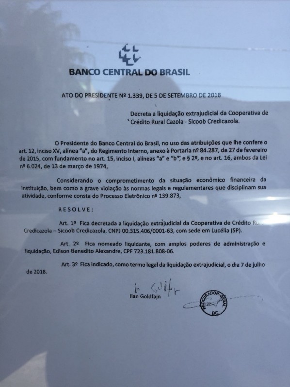 O Banco Central decretou na manhã desta quarta-feira (5), por meio do Ato do Presidente nº 1.339, a liquidação extrajudicial da Cooperativa de Crédito Rural Cazola - Sicoob Credicazola, que tem sede em Lucélia.