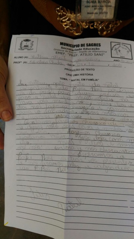 Na tarde desta quinta-feira (14), aconteceu o sorteio de uma carta escrita por um dos alunos participantes do projeto Natal em FamÃlia, uma iniciativa do Poder Judiciário da Comarca de Osvaldo Cruz, através da juÃza da 1ª Vara da Comarca local, Dra Ruth Duarte Menegatti.