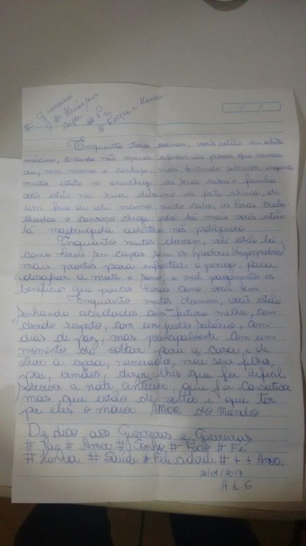 O Cabo PM Marcos Antônio e Soldado PM Willian, que estavam de serviço, por volta dos 30 primeiros minutos do dia 21 de abril, ao chegar pelo GP, encontraram uma carta na porta, dedicada aos Guerreiros.