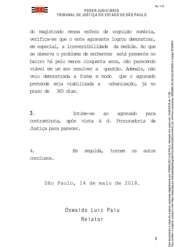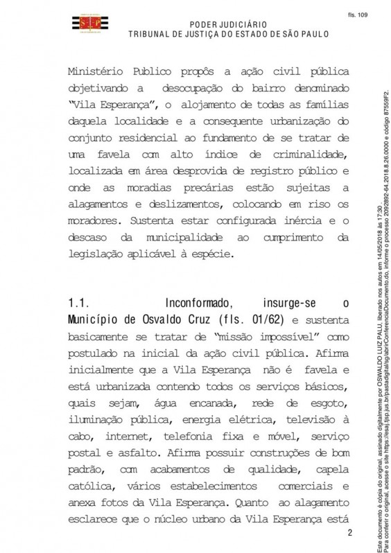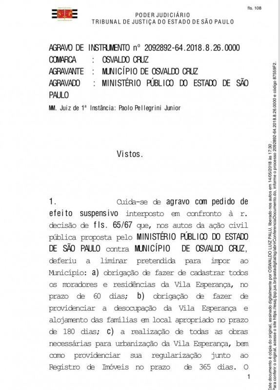 Portanto, segundo a nova determinação da justiça, que acatou o recurso Agravo de Instrumento, impetrado pelo municÃpio de Osvaldo Cruz, as famÃlias residentes na Vila Esperança não correm, pelo menos até que o caso seja julgado, riscos de precisarem deixar suas casas e o bairro onde vivem.