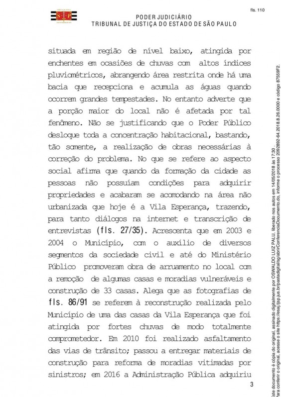 Diante da determinação da Justiça da comarca de Osvaldo Cruz, concedendo liminar solicitada pelo Ministério Público, que determinava uma série de ações na Vila Esperança, cujas determinações, com prazos curtos, declarava ser de obrigação do municÃpio o cadastramento das famÃlias e das residências do bairro no prazo de 60 dias e a remoção de todos os moradores para outro local mais adequado, livre dos problemas apontados pela Ação Civil Pública, em até 180 dias.