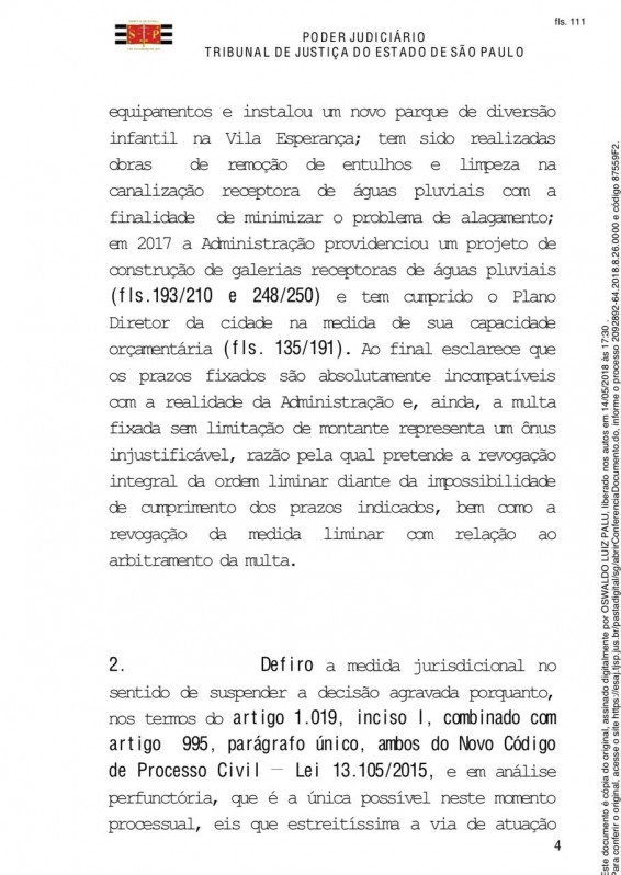Entendendo ser esta uma missão impossÃvel de realizar, por várias razões, entre as quais, tempo muito curto e especialmente a falta de recursos para tal, o municÃpio de Osvaldo Cruz impetrou recurso, solicitando a suspensão da referida liminar e conseguiu que a mesma fosse suspensa, o que faz com que tudo continue como está, até que o caso seja julgado.