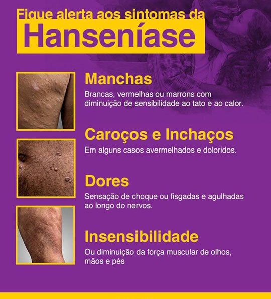 Os sintomas mais comuns são: manchas esbranquiçadas, avermelhadas ou amarronzadas, em qualquer parte do corpo, com perda ou alteração de sensibilidade térmica (ao calor e frio), tátil (ao tato) e à dor, que podem estar principalmente nas extremidades das mãos e dos pés, na face, nas orelhas, no tronco, nas nádegas e nas pernas; área de pele seca e com falta de suor, sensação de formigamento, dor e sensação de choque, ulceras de pernas e pés e caroços no corpo. Há ainda casos em que não há lesões na pele, mas ocorre o comprometimento de nervos periféricos.