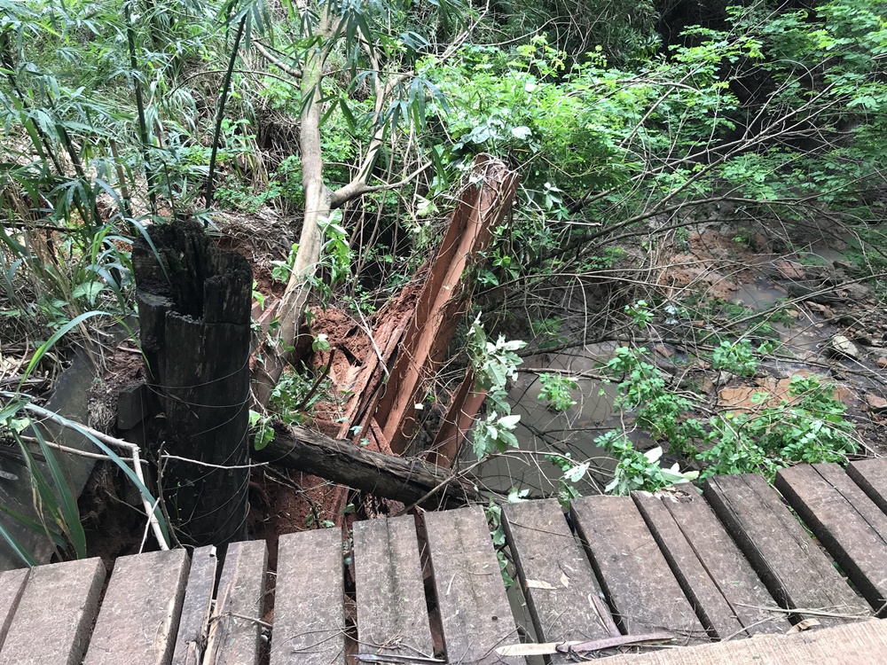 A conctenção composta por colunas metálicas e peças de madeira foi atingida e houve movimentação de terra no local. Se continuarem as chuvas, os danos podem se ampliar no local e expor a estrutura e segurança da ponte.