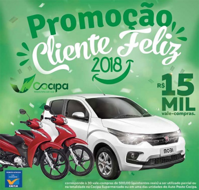 A Promoção Cliente Feliz Cocipa 2018 sorteará um veículo Fiat Mobi e duas motos, veículos zero quilômetro, e mais R$ 15 mil em vale-compras.