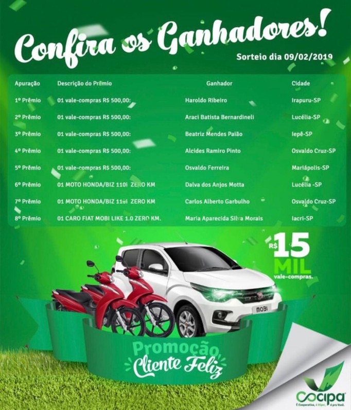 Durante a Promoção Cliente Feliz Cocipa 2018/2019 foram sorteados um veículo Fiat Mobi, duas motos Honda Biz e mais R$ 15 mil em vale-compras. No total foram 33 ganhadores. Os cupons foram distribuídos para cooperados que compraram acima de R$ 100,00 na Cocipa Hipermercado ou R$ 50,00 nos Auto Postos Cocipa de Inúbia Paulista, Osvaldo Cruz e Adamantina.