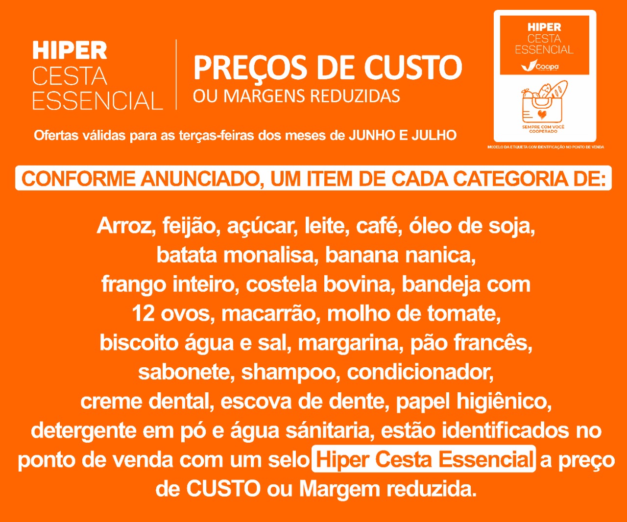 Todos os itens participantes estarão, às terças-feiras, identificados com o selo “Hiper Cesta Essencial Cocipa”. Uma lista também ficará disponível na entrada da loja.