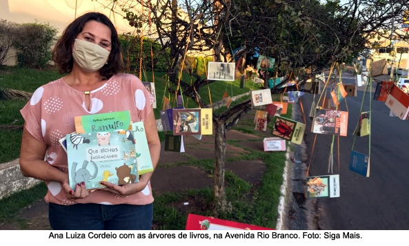 Nessa região, Ana Luiza encontrou uma sequência de árvores de pequeno porte, o que facilita pendurar os livros, bem como o acesso, em especial pelas crianças. "Elas mesmas retiram e ficam encantadas", comemora.
