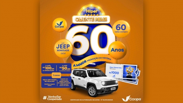 Teve início nesta quinta-feira, 1 de julho, a promoção Hiper Cliente Feliz Cocipa, uma das mais tradicionais do setor, na região. Para este ano, em comemoração aos 60 anos da Cooperativa, a ação vai sortear 60 vales-compra de R$ 1 mil cada e um Jeep Renegade 0km. O automóvel é avaliado em R$ 92.403,00 mil. O valor total dos prêmios é de R$ 152.403,00.