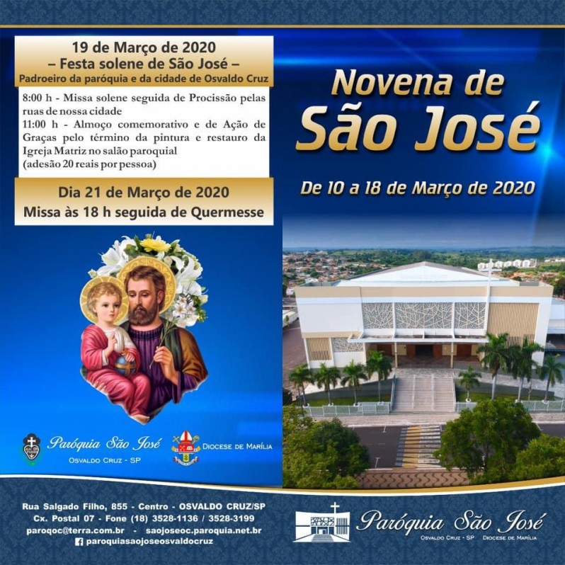 A Paróquia São José de Osvaldo Cruz realiza de 10 a 19 de março os festejos e programação religiosa da Festa do Padroeiro da cidade.
