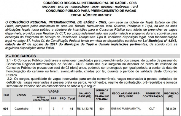 O Consórcio Regional Intermunicipal de Saúde, formado pelos municÃpios de Bastos, Iacri, Arco-Ãris, Herculândia, Queiroz, Rinópolis e Tupã, abriu inscrições do concurso público, com intuito de preencher vagas disponÃveis, providos pelo regime da CLT, por prazo indeterminado, em conformidade e enquanto durar o convênio para execução do Programa de Serviço de Residência Terapêutica Tipo II.