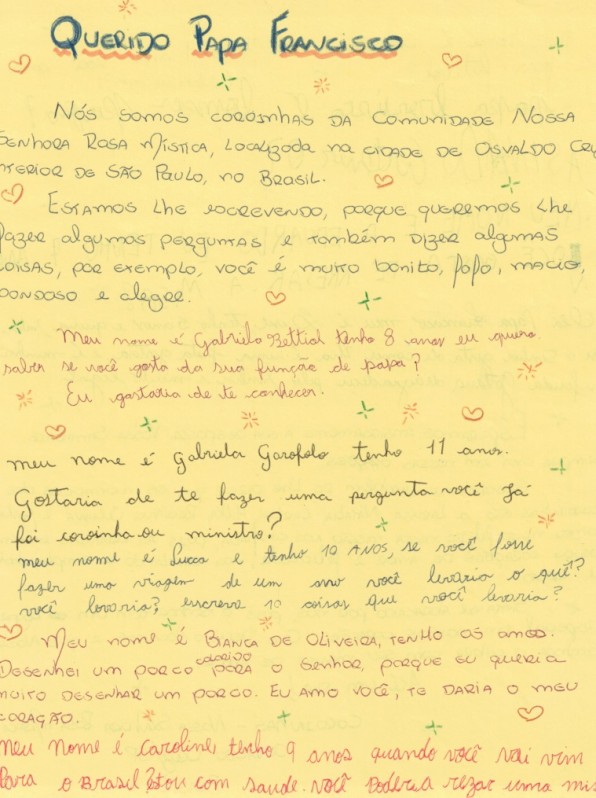 Crianças que atuam como Coroinhas na Comunidade Nossa Senhora da Rosa MÃstica, receberam uma carta muito especial: uma resposta do Papa Francisco a uma mensagem enviado por elas em Março de 2017.