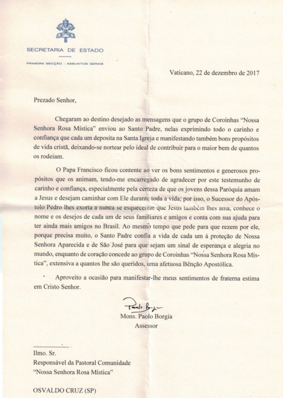 A carta veio assinada pelo Monsenhor Paolo Bórgia, assessor para "Assuntos Gerais da Secretaria de Estado", que é quem cuida junto com outros, das leituras de milhares de correspondências que o Papa recebe.