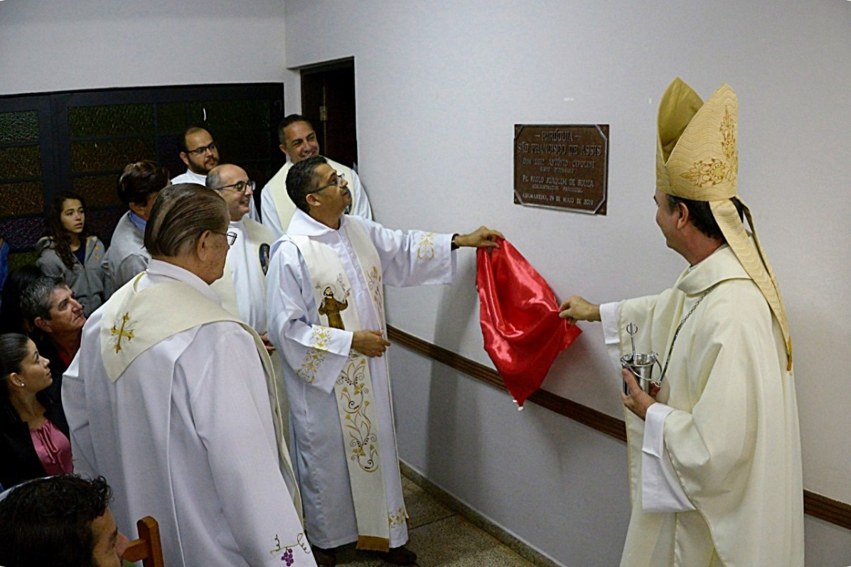 Uma placa comemorativa, em alusão à elevação da Paróquia, foi descerrada pelo Bispo Dom Luiz Antônio Cipolini, padre Paulo Joaquim de Souza e padres concelebrantes.