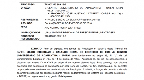 “Em análise, as contas do exercício de 2018 do Centro Universitário de Adamantina -UNIFAI.