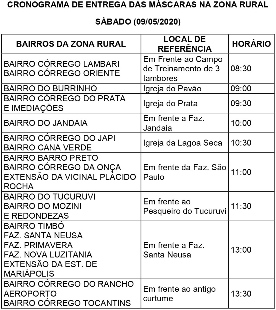 No sábado (09), os bairros que receberão as máscaras serão: Bairro Córrego Lambari, Bairro Córrego Oriente, Bairro do Burrinho, Bairro córrego do Prata e imediações, Bairro do Jandaia, Bairro córrego do Japi, Bairro Cana Verde, Bairro Barro preto, Bairro Córrego da Onça, Extensão da Vicinal Plácido Rocha, Bairro do Tucuruvi, Bairro do Mozini, Bairro Timbó, Fazenda Santa Neuza, Fazenda Primavera, Fazenda Luzitânia, Bairro Córrego do Rancho e Bairro Tocantins.