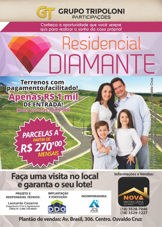No último sábado (29), o Grupo Tripoloni e a Nova Imobiliária realizaram o lançamento do Residencial Diamante, em Osvaldo Cruz.
