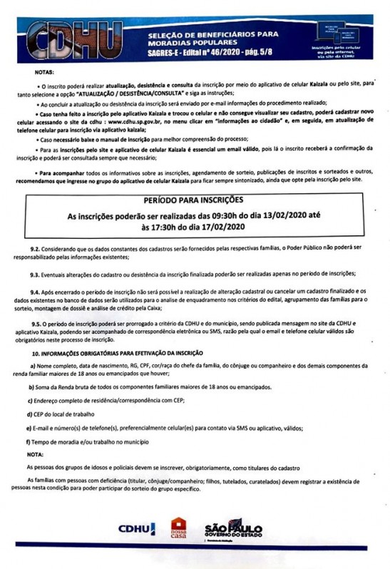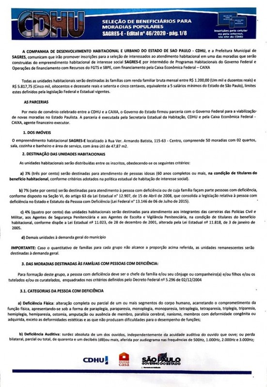 A Prefeitura de Sagres e a CDHU (Companhia de Desenvolvimento Habitacional e Urbano do Estado de São Paulo) estão com inscrições abertas para interessados em uma das moradias que serão construídas no empreendimento habitacional denominado 'Sagres E', por intermédio de Programas Habitacionais do Governo Federal e Operações de financiamento com recursos de FGTS e SBPE, com financiamento pela Caixa Econômica Federal.