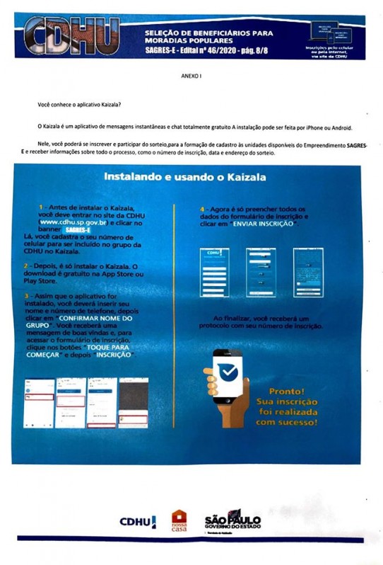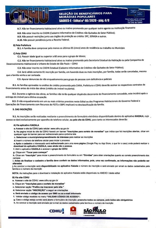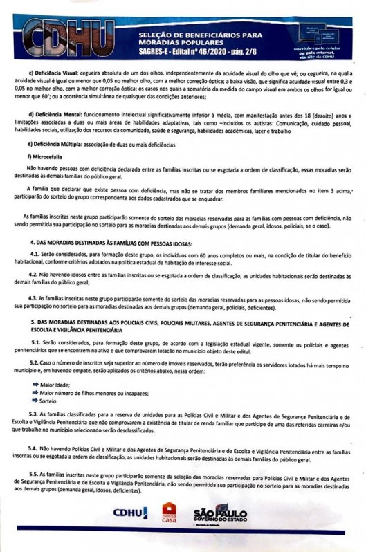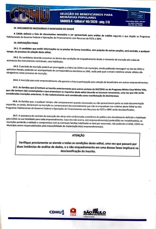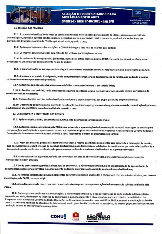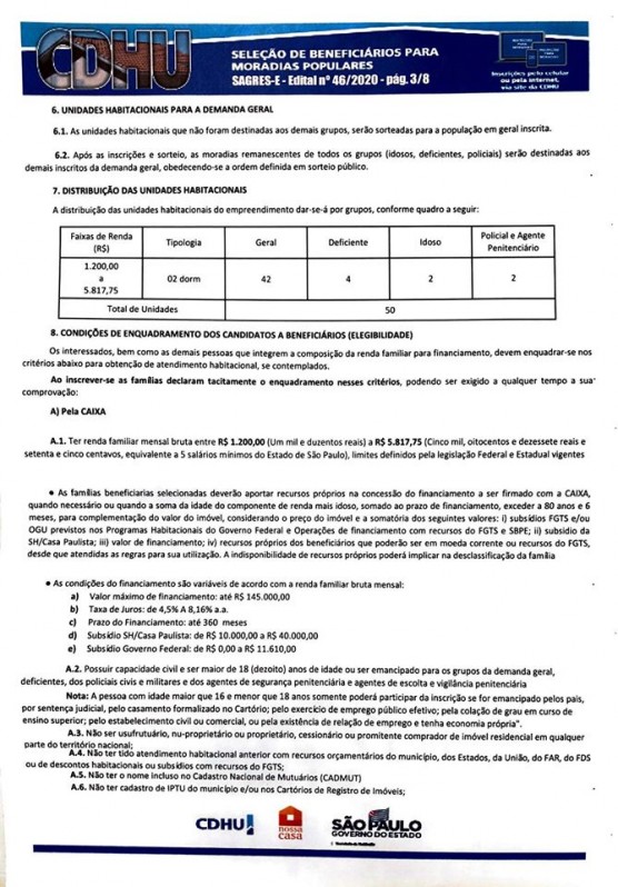 Segundo consta no edital, todas as unidades habitacionais serão destinadas às famílias com renda familiar bruta mensal entre R$1.200,00 e R$5.817,75, limites definidos pela legislação Federal e Estadual.