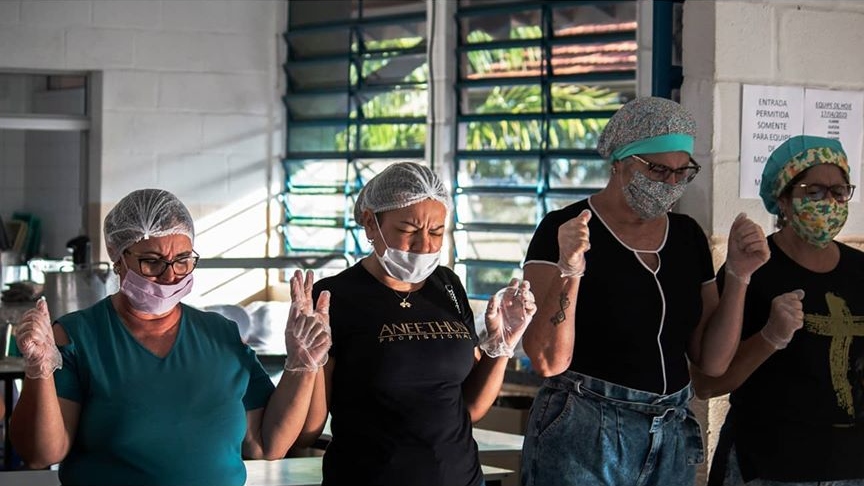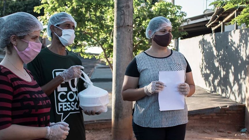 Os voluntários trabalham utilizando equipamentos de proteção individual, como máscaras e luvas. A medida protege os envolvidos e garante segurança sanitárias às refeições. Antes do início dos trabalhos, se unem em oração, onde buscam também a proteção pela fé.