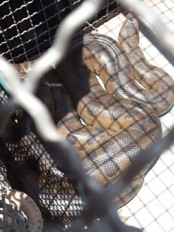 A equipe que atendeu a ocorrência era integrada pelos agentes, Sargento Casarim e Soldado Vieira, que se dirigiram até o local, e, chegando na propriedade, encontraram o animal em cima de um pé de goiaba, próxima a um chiqueiro. Segundo informações dos bombeiros, as características do animal é de uma jibóia, que muito provavelmente estava procurando por comida.
