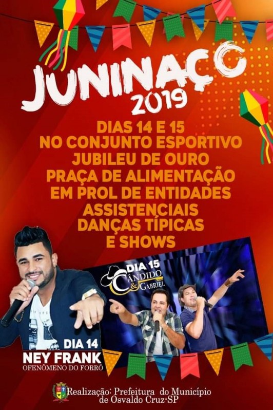Como parte do programa de Aniversário de 78 anos de Fundação de Osvaldo Cruz, nas próximas sexta-feira (14) e sábado (15) sempre a partir das 19h30, no Conjunto Esportivo “Jubileu de Ouro” acontecerá o Juninaço 2019.