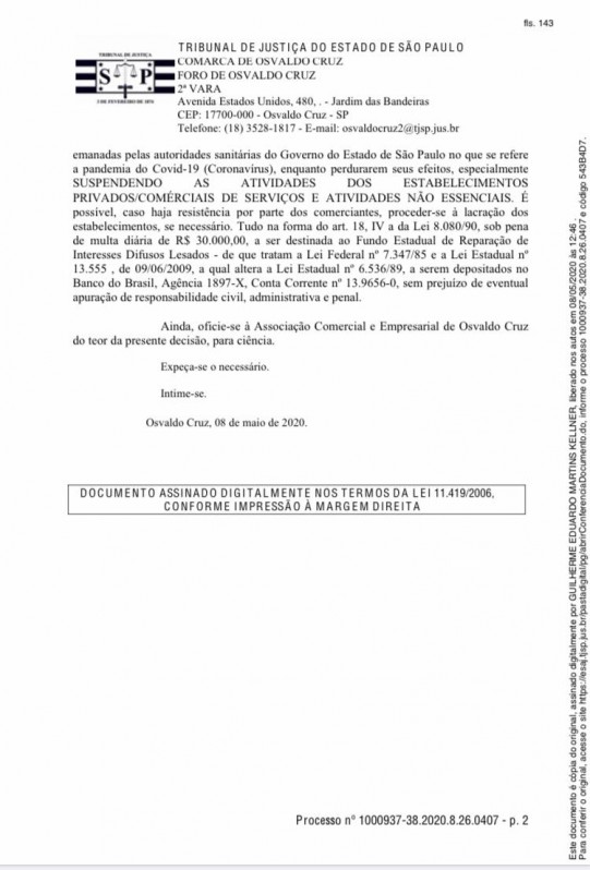 O Juiz de Direito da 2ª Vara da Comarca de Osvaldo Cruz, Dr. Guilherme Eduardo Martins Kellner, proferiu no início da tarde desta sexta-feira (08), decisão liminar diante da Ação Civil Pública proposta pelo Ministério Público Estadual de Osvaldo Cruz, por meio dos promotores de justiça oficiantes na Comarca e acatou o pedido proibindo as atividades de estabelecimentos considerados não essenciais.