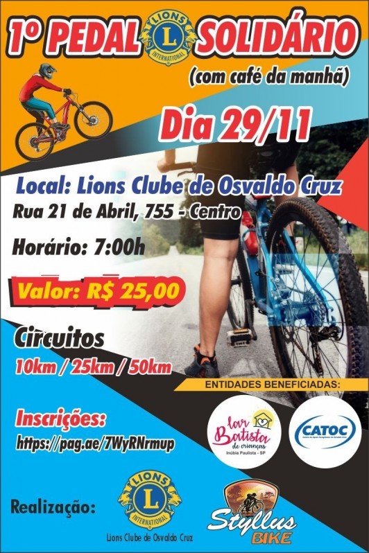 O Lions Clube de Osvaldo Cruz realiza neste domingo (29), o primeiro café da manhã e Pedal Solidário em prol ao Lar Batista de Crianças de Inúbia Paulista e a Catoc de Osvaldo Cruz. O Pedal Solidário terá circuitos de 10km / 25km / 50km. O valor de Inscrição é de R$ 25,00.