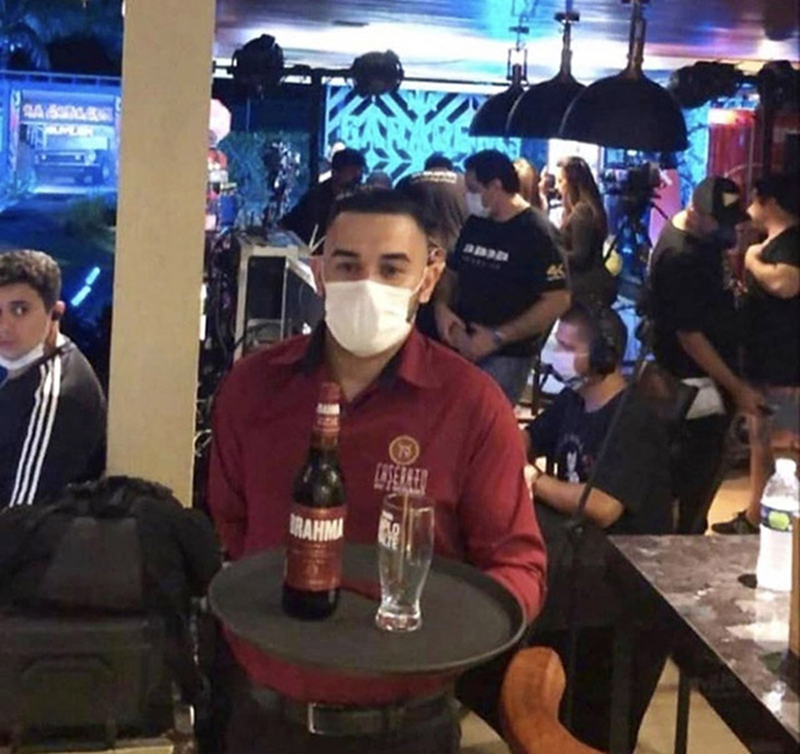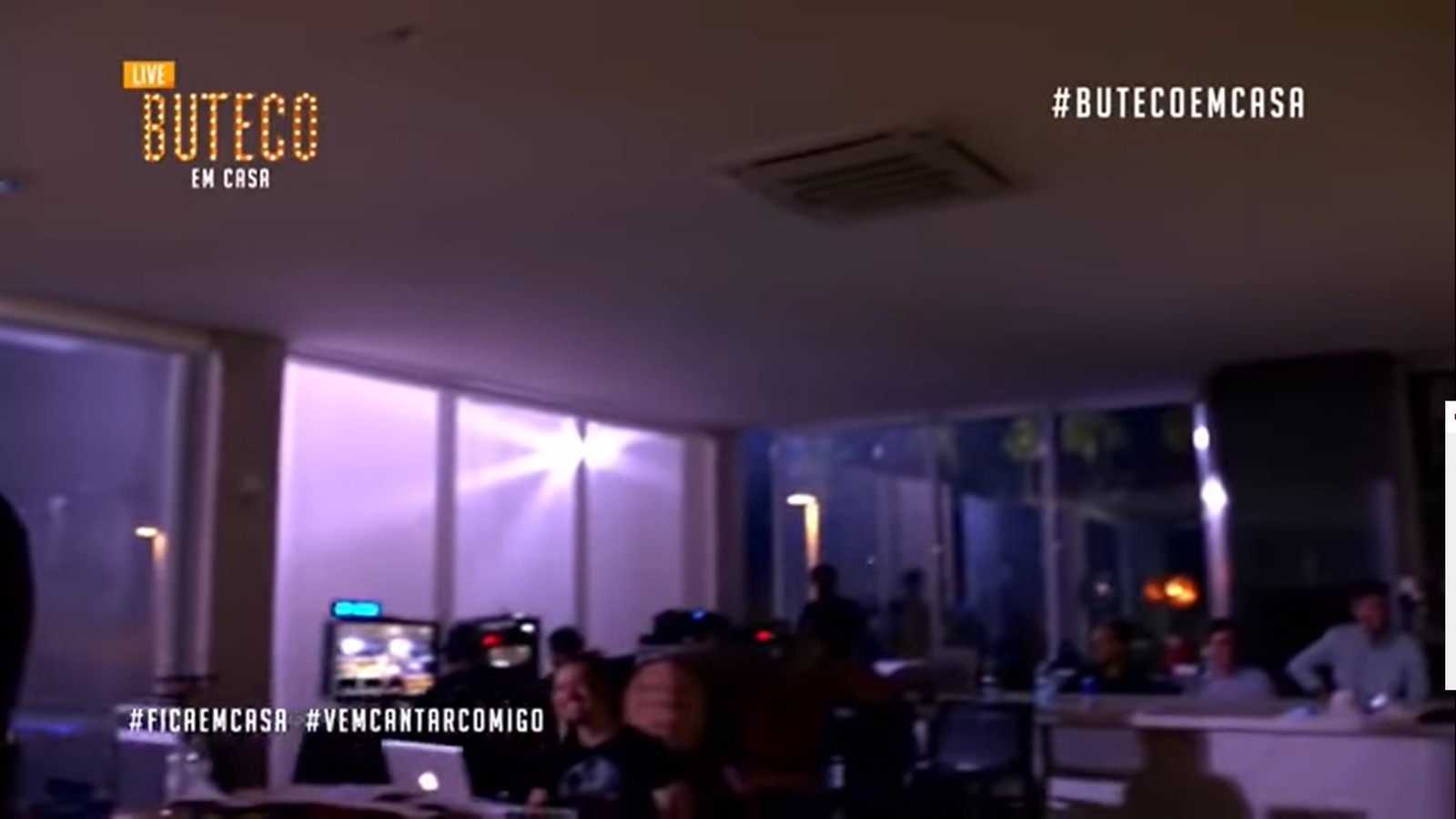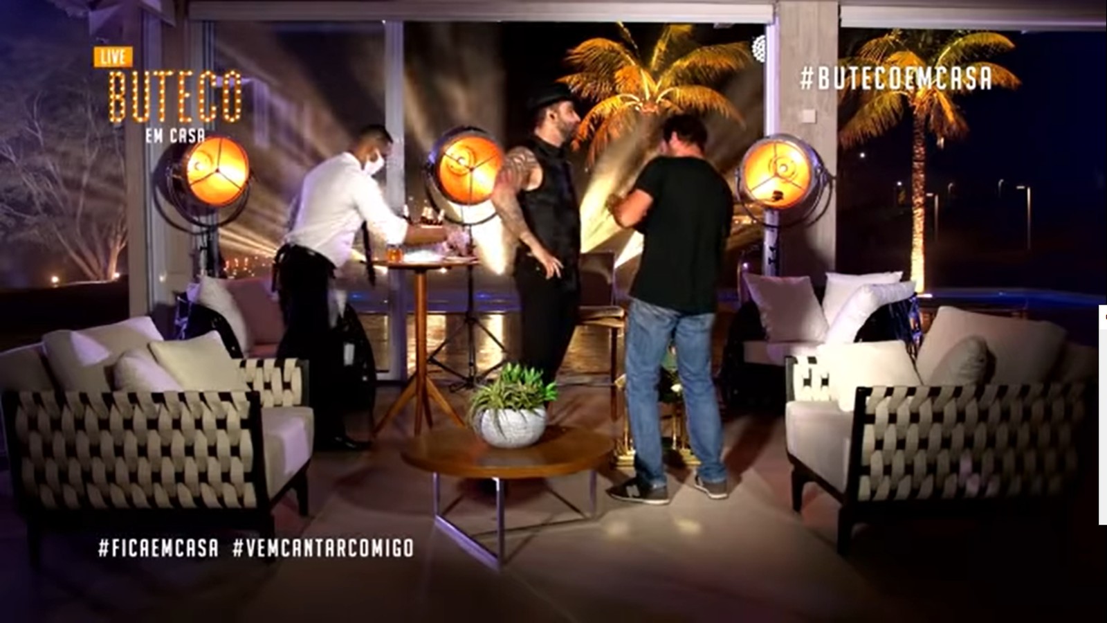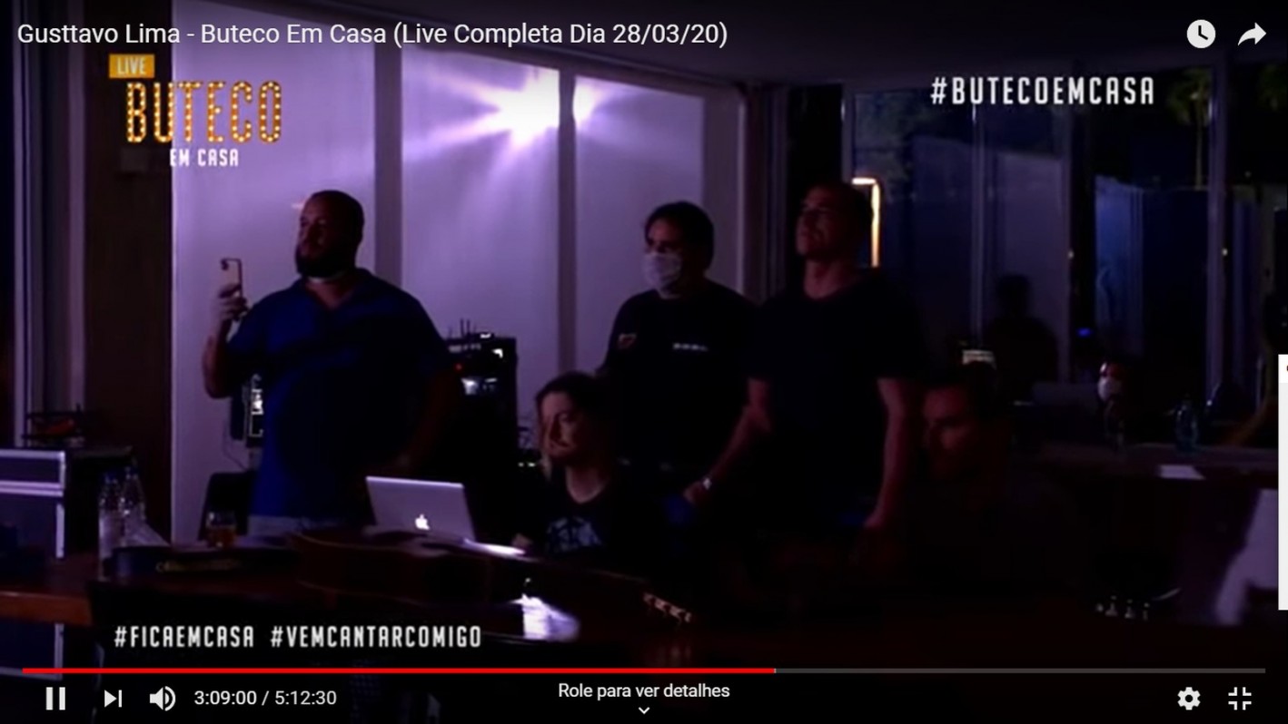 Na live de Gusttavo Lima, havia câmeras, garçom servindo cerveja e churrasco, violonista e uma equipe de vídeo que ocupava um escritório improvisado atrás da sala. Só entre as que apareciam ao fundo em algumas cenas, eram cerca de dez pessoas - umas de máscara, outras não.