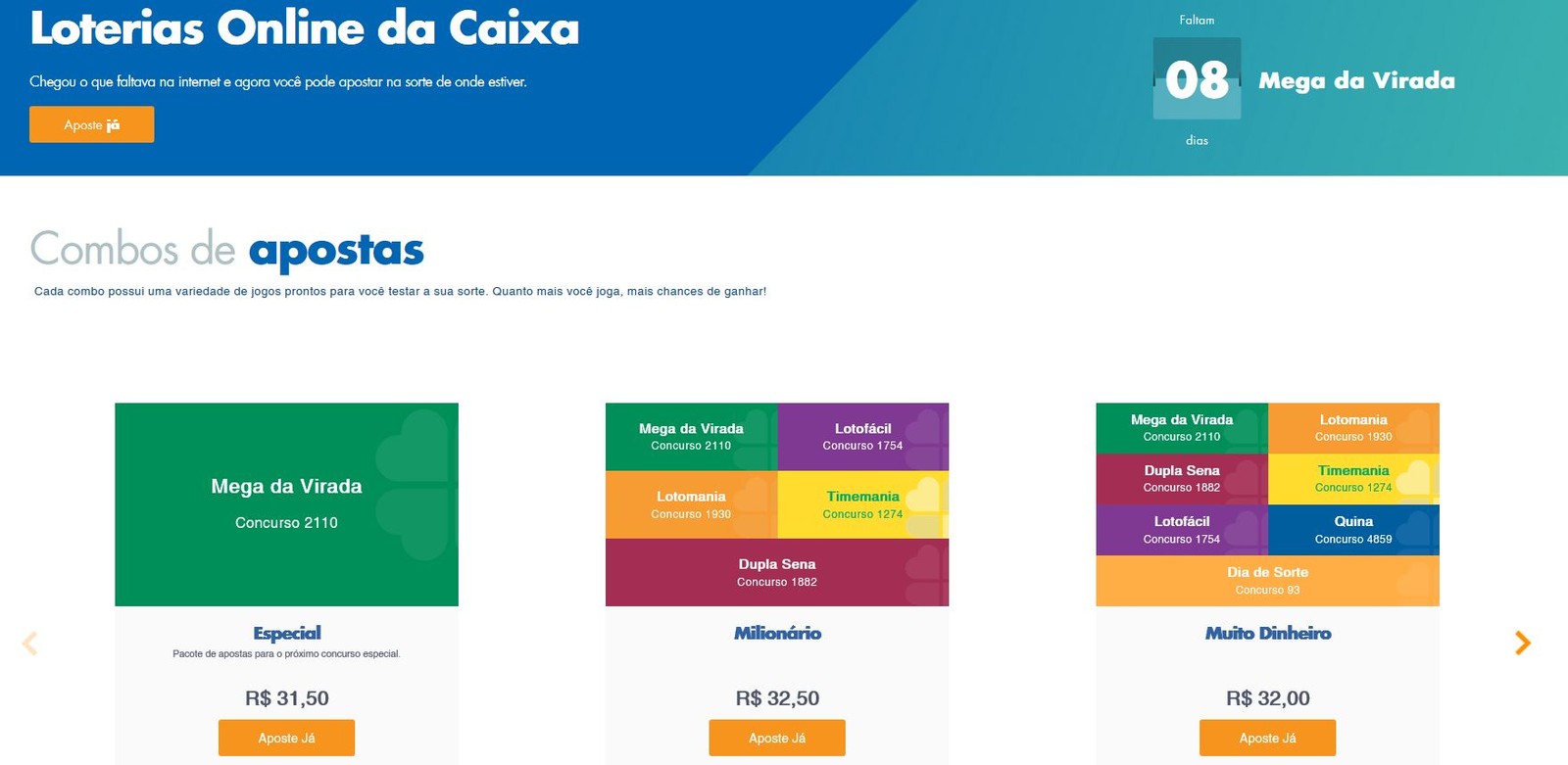 Outra novidade do sistema online é o combo de apostas. Ao acessar o site, já na página inicial, é possível escolher entre cinco diferentes conjuntos de apostas que podem ser de uma modalidade de jogo.