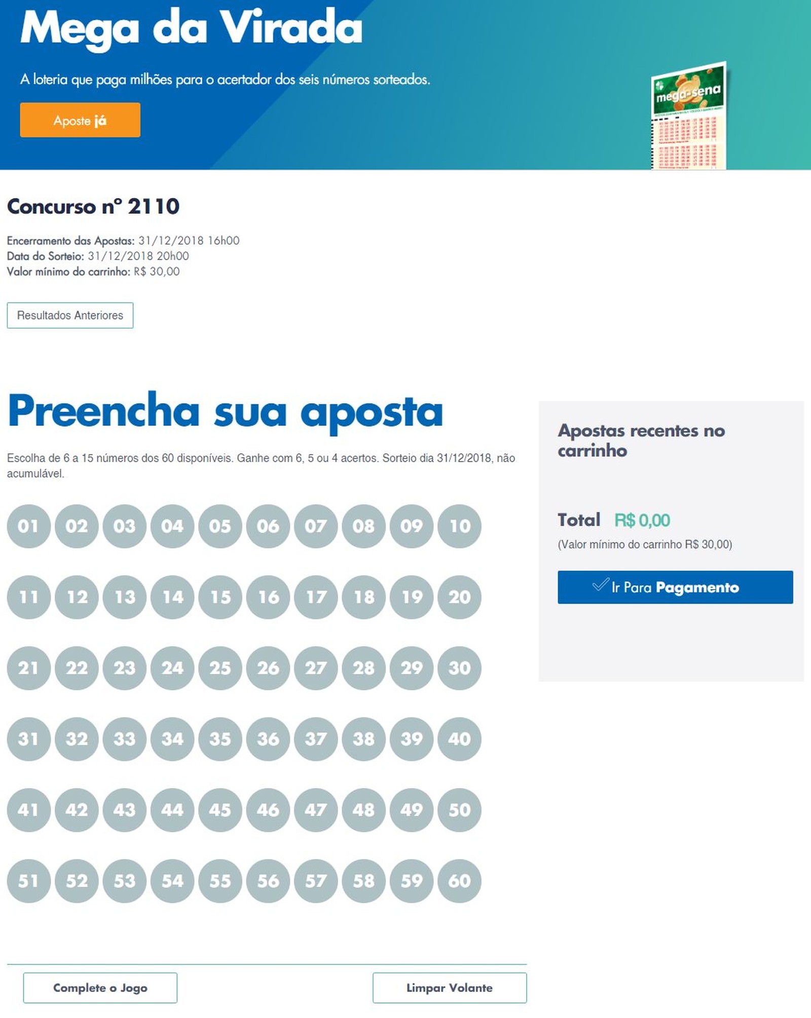 Ao entrar no sistema, o internauta precisará escolher a opção Mega da Virada e depois clicar em Aposte Agora. O sistema mostrará números de 1 a 60 para o apostador escolher.