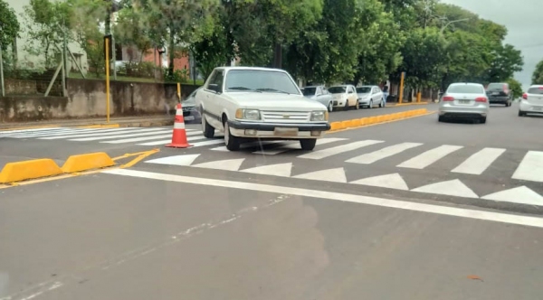 Os recentes segregadores de trânsito, modelo prisma, instalados semana passada pelo Departamento Municipal de Trânsito (Demtran) na Avenida Rio Branco, entre as ruas Tsunekishi Sakai e Syrlene Rodrigues de Castro, em frente ao Supermercado Sete ainda não se mostram suficientes para disciplinar o trânsito, pelo menos para um motorista que usou a lombofaixa para furar essas barreiras.