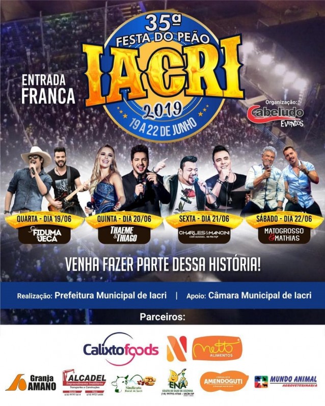 A 35ª Festa do Peão Boiadeiro de Iacri, que começou na quarta-feira (19) e termina neste sábado (22) integra a programação dos 86 anos da cidade. A festa tem entrada franca todas as noites, com realização da Prefeitura Municipal e apoio da Câmara Municipal. A organização do evento é da Cabeludo Eventos.