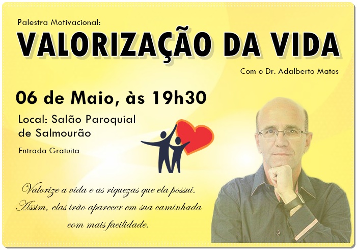 A Paróquia São João Batista de Salmourão, realiza nesta segunda-feira (06) no Salão Paroquial, a partir das 19h30, uma importante palestra que será ministrada pelo Psicólogo Dr. Adalberto Matos.