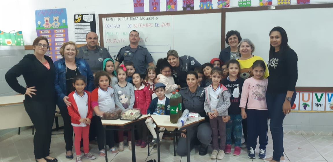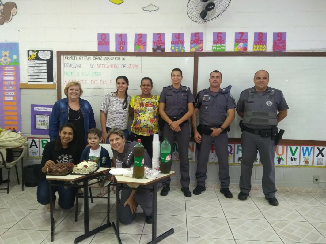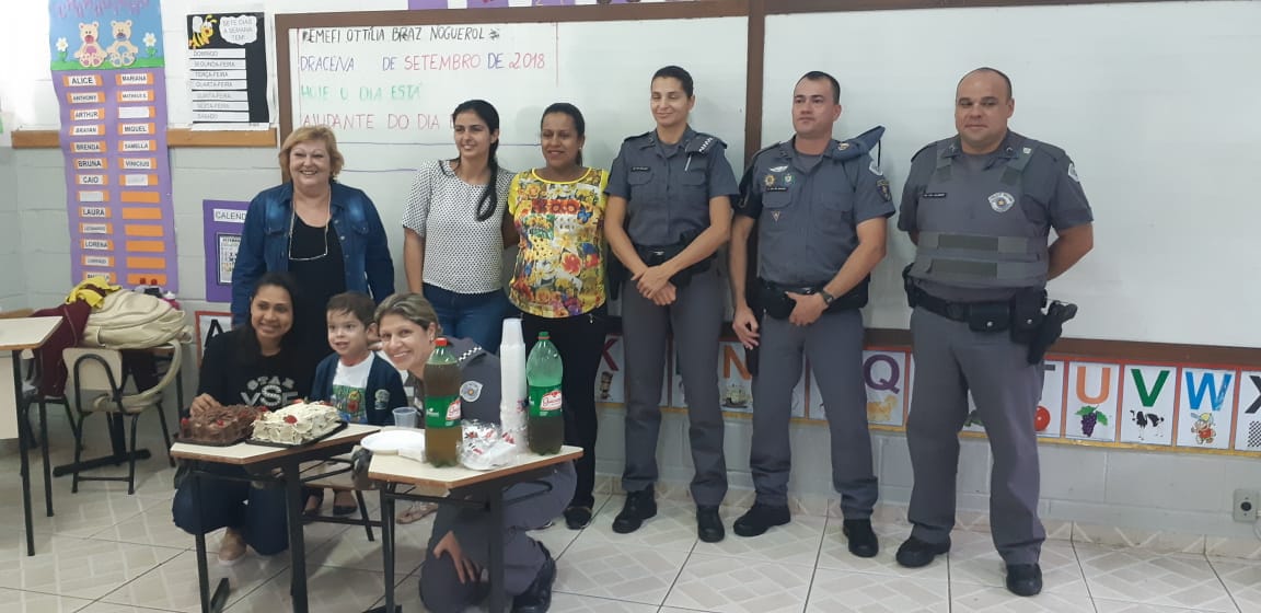 Em uma parceria da Polícia Militar de Dracena, com a professora do menino e familiares, uma guarnição e policiais militares do 25º BPMI foram até a sala do Pré 2 das professoras Élida e Tayná.