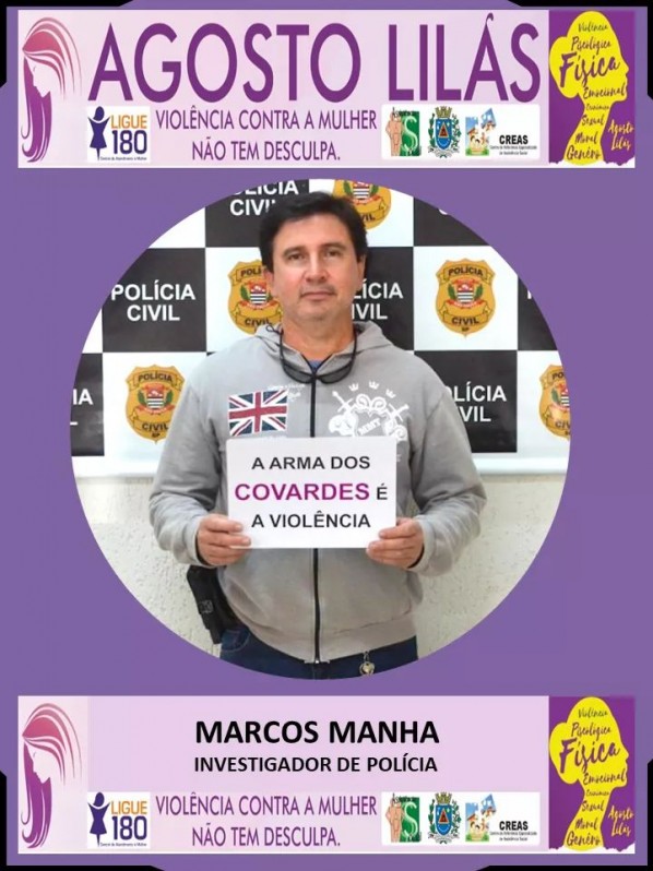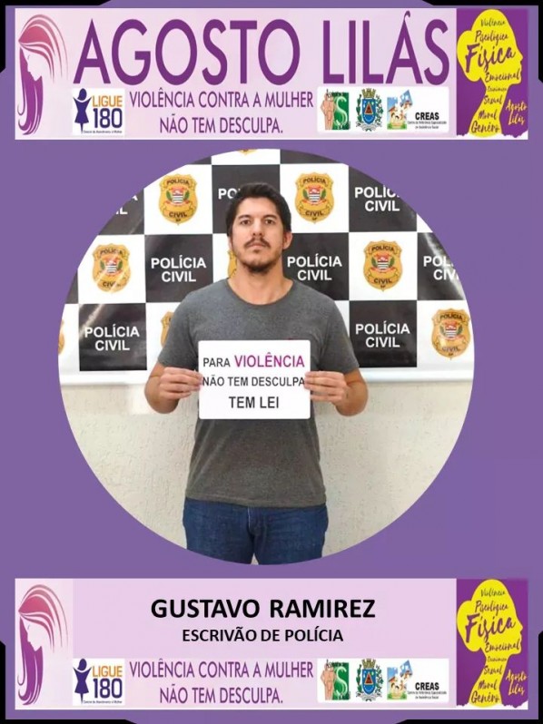 Atendendo prontamente ao convite do Centro, o Delegado de Polícia Dr. Yuri Munhoz Silveira e os policiais Marcos e Gustavo posaram para a campanha ostentando frases de efeito contra a violência que afeta a mulher, desestimulando tais ações e incentivando que as vítimas procurem as autoridades para sua defesa.