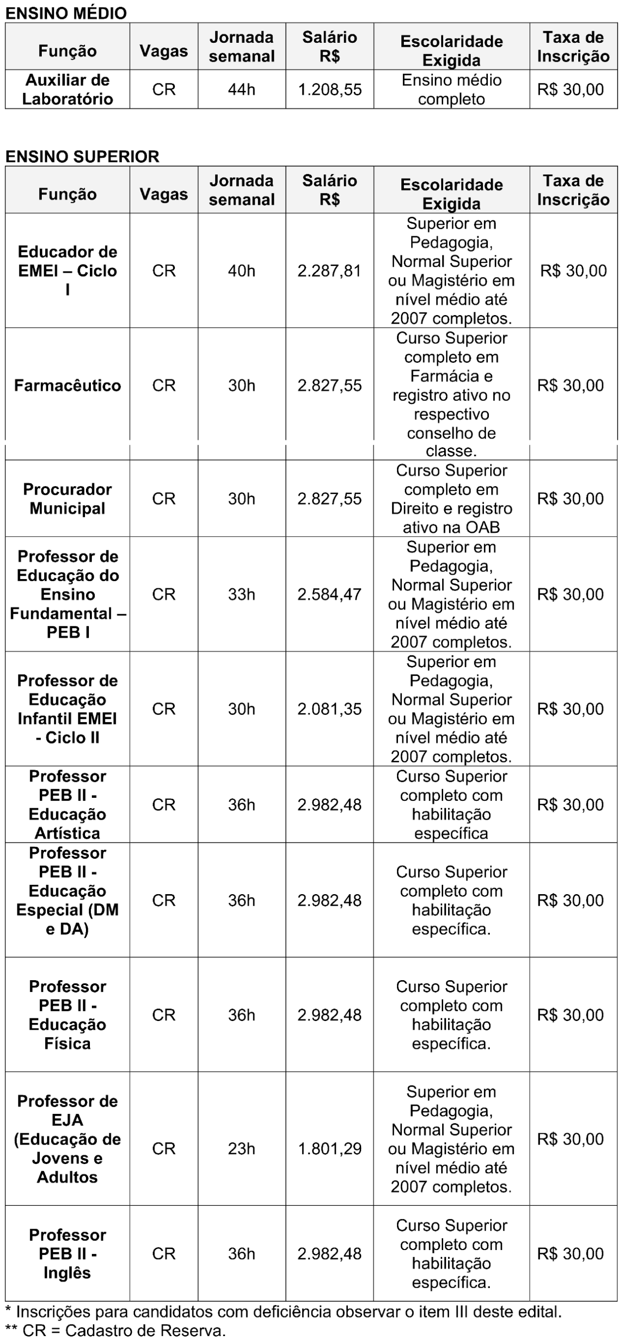 As vagas são para as funções de: auxiliar de laboratório, educador de EMEI – Ciclo I, farmacêutico, procurador municipal, professor de educação do ensino fundamental – PEB I, professor de educação infantil EMEI – Ciclo II, professor PEB II – educação artística, professor PEB II – educação especial (DM e DA), professor PEB II – educação física, professor de educação de jovens e adultos, professor PEB II – inglês.