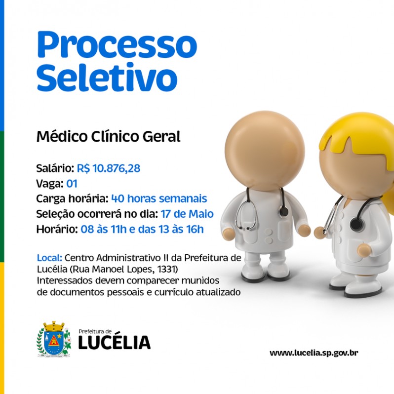 A Prefeitura de Lucélia estará realizando Seleção para contratação emergencial de 01 (uma) vaga de Médico Clínico Geral para atuar junto à equipe do Centro de Saúde local.