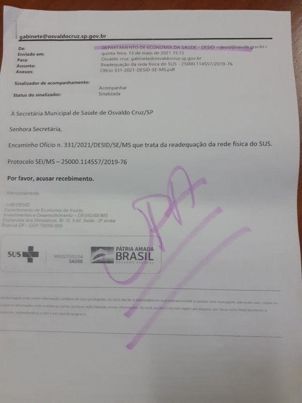 A Prefeita Vera Lúcia Alves, destacou que saiu uma portaria do Ministério da Saúde liberando o prédio para o município. “Estou muito feliz de poder divulgar que o Ministério da Saúde liberou o prédio da UPA (Unidade de Pronto Atendimento) para a prefeitura. Há cerca de 8 anos o prédio estava pronto aqui em Osvaldo Cruz e como não foi utilizado pelo município, foi devolvido para o Governo Federal. O prédio está todo depredado, mas a partir de agora vamos iniciar os tramites legais para a devolução do dinheiro do convênio, dinheiro que já estava aplicado no município, e essa portaria tem a exigência da devolução do dinheiro, então vamos devolver para que a gente possa iniciar a recuperação do prédio.”, disse.