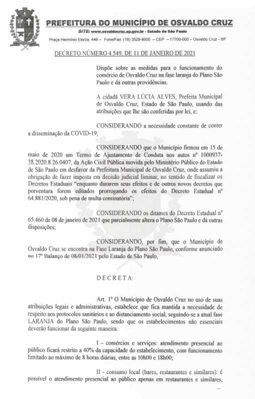 Prefeitura de Osvaldo Cruz edita Decreto 4.549/2021 de 11/01/2021 e disciplina funcionamento de setores da economia na fase Laranja do Plano São Paulo