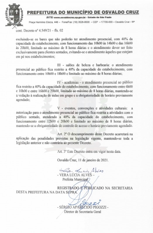 O 4.549/2021 de 11/01/2021 disciplinou o que pode e o que não pode funcionar na cidade. Antes da edição do novo decreto a Prefeitura manteve reunião com os presidentes da Associação Comercial e Empresarial (Aceoc) e Sindicato do Comércio Varejista (Sincomércio) para ouvir das entidades as sugestões para adequações dos horários.